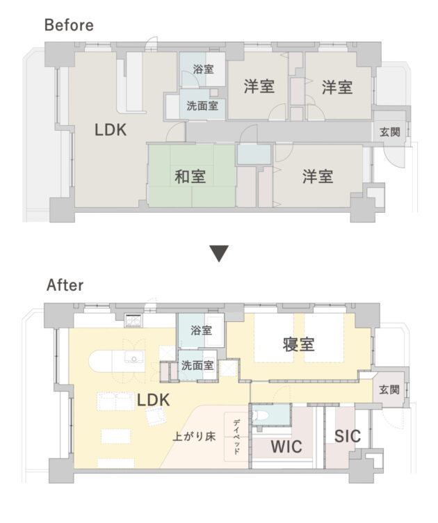 ファミリー向け4LDKから変身を遂げ完成したのは、空間を贅沢に使ったゆとりある1LDKです。21帖のLDK、9帖の寝室に加え、3.3帖のシューズインクローゼット(SIC)と4帖のウォークインクローゼット(WIC)を新たにつくりました。