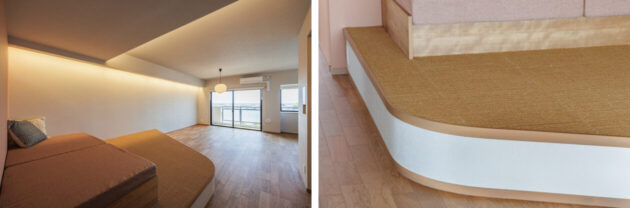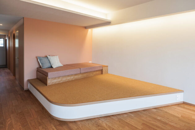 広いリビングエリアには上がり床と造作のデイベッドを。ゲストが多いときには段差がベンチ代わりにも