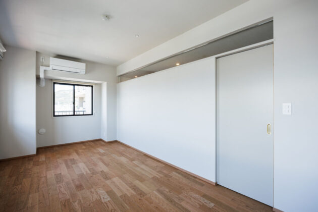 北側の洋室は、廊下側の壁上部に明り取りのフィックスガラスをはめ込んでいます