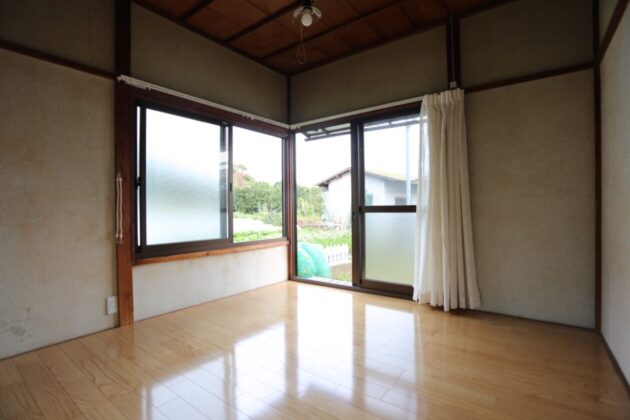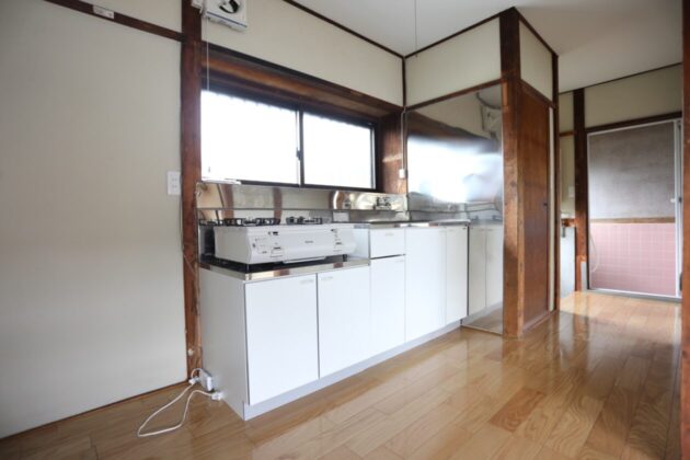 外観からはかなりレトロな平屋という感じがしますが、きちんとリフォームされていて問題無く住めます。廊下や居室の床は交換済みで、キッチン台・トイレも新しめのものが設置済み、勝手口部分に洗濯機置場を作り室内で洗濯できるようになっています。さらに、窓サッシは全てペアガラスのサッシに交換済み。昔ながらの木のサッシだと隙間から虫が入ってきたり、寒い隙間風が吹き込んできたりするので、その部分がクリアされるのはありがたいです。