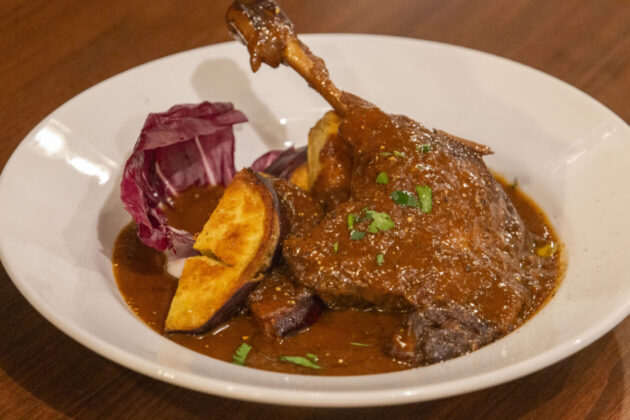 ほろほろのお肉に深みのあるソースが絡む「骨付き鴨もも肉の赤ワイン煮込み 鳴門金時添え」