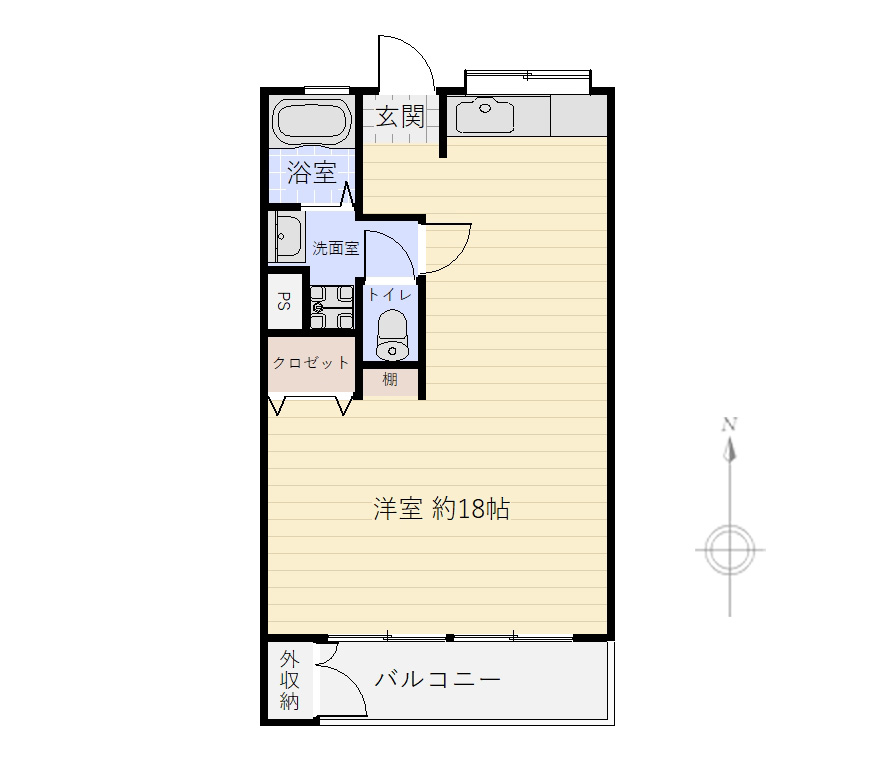 右手が玄関、中央のドアの向こうにはトイレ、洗面台、浴室があります