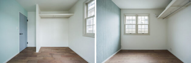 2階の洋室はご家族みなさまの寝室として使っていましたが、お子さまの成長を見越してふたつの子ども室へ。壁紙はお子さまに選んでいただきました。