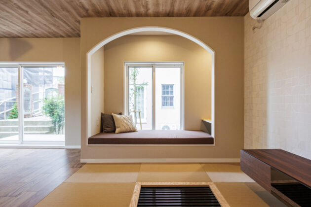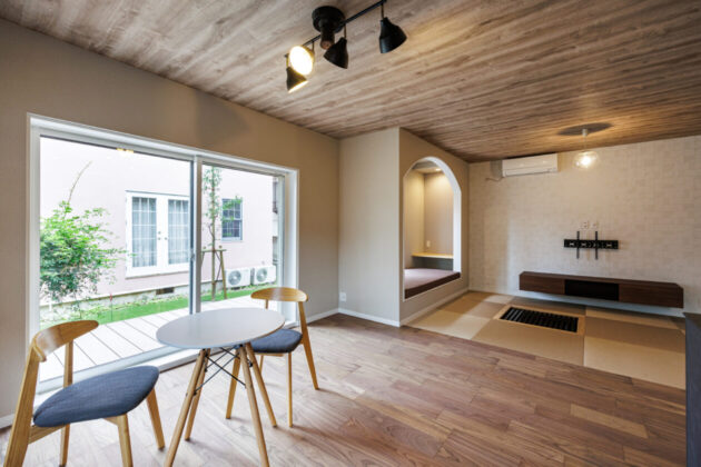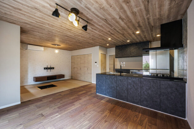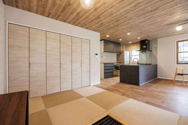もともと和室だったエリアは敷居や鴨居を取り払ってダイニングとシームレスにつなげ、既存の掘りごたつを活かして畳リビングへと変身。縁のない琉球畳へ交換し、隣り合うフローリングとも相性のよいスタイリッシュな雰囲気になりました。写真にはありませんが、新しい内装に合う掘りごたつ用テーブルをオーダーメイドで製作。ヌックのソファベンチと掘りごたつのお陰で大きなソファやイスを置く必要がなく、空間をゆったり使えます。お施主さまは冬場はこたつを囲んでご家族でくつろいでいるそう。