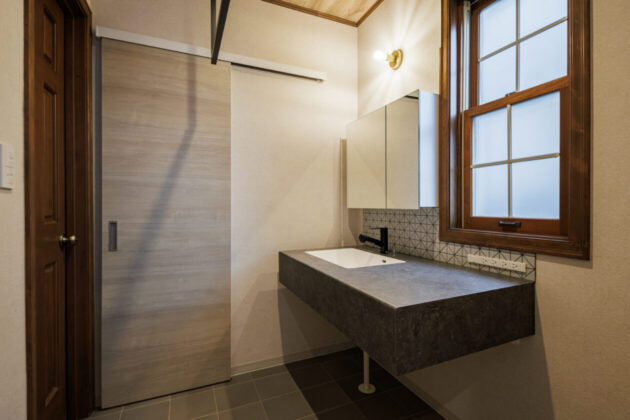 1F・洗面室:洗面台は天板とシンクが一体型のためお掃除ラクラク。廊下側のドアは開放しておける引戸へ変更し風通しよく