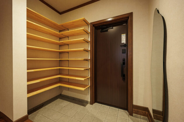 1F・玄関:既存の下駄箱を取り払いオープン棚を設置