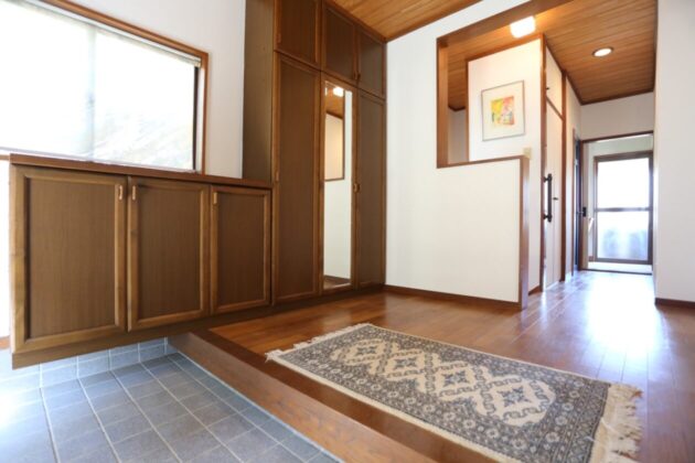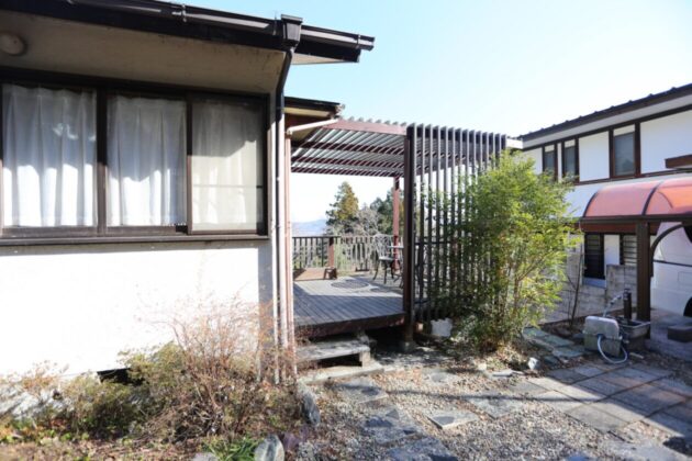 グリーンヒルのほとんどの土地が傾斜地に建っているため玄関に入るのに階段を上がる必要がある物件が多いですが、この物件は道路と同じ高さで階段を使わずに家に入ることができます。