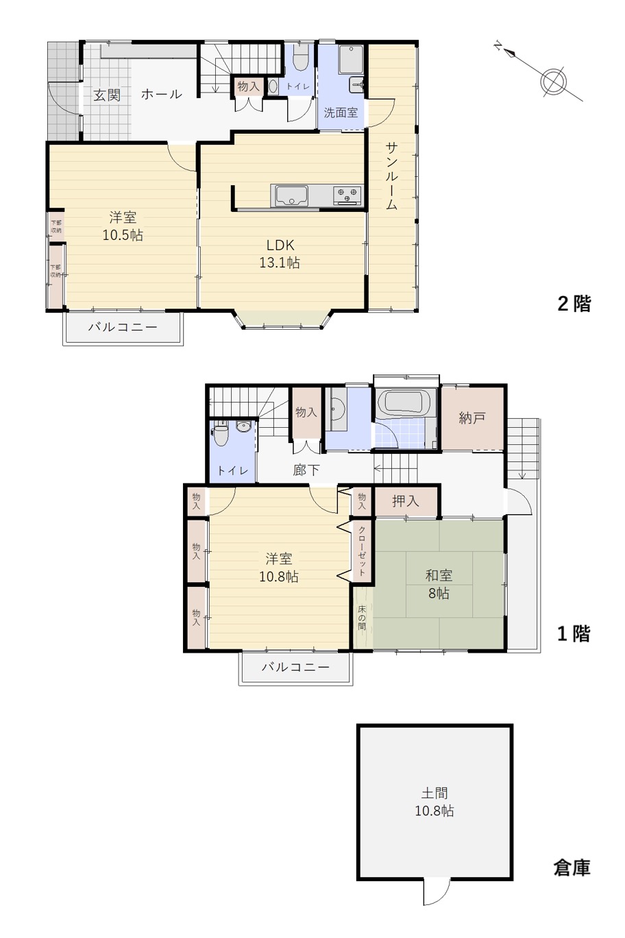 南西側と北東側の壁、それぞれほぼ一面が収納となっています