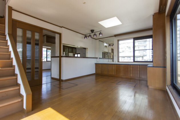 階段を上がると、そこには3面採光の明るいLDKが広がっています。東側に大きく開いた窓は朝の時間も気持ちよく演出してくれるはず。窓を開ければ爽やかに風が通って、家族が自然と集まる心地よい空間になりそうです。