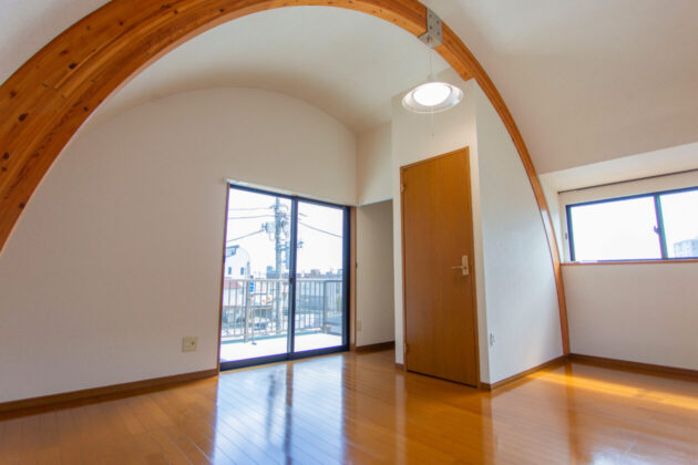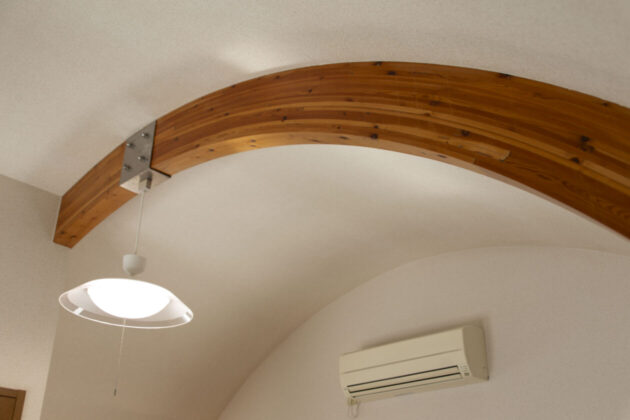 さぁさぁ、いよいよ!ここがあのかまぼこ屋根の内側です。外から見たまんまのあの形のお部屋を、美しく弧を描いた梁が縁取っています。このまんまるでウッディな感じが、疲れて帰ってきたこころをほっこり包んでくれて…う〜ん、いいなぁ。