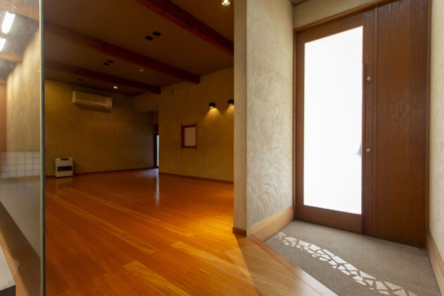こちらは住居側の玄関。左手はコンパクトめな駐車場