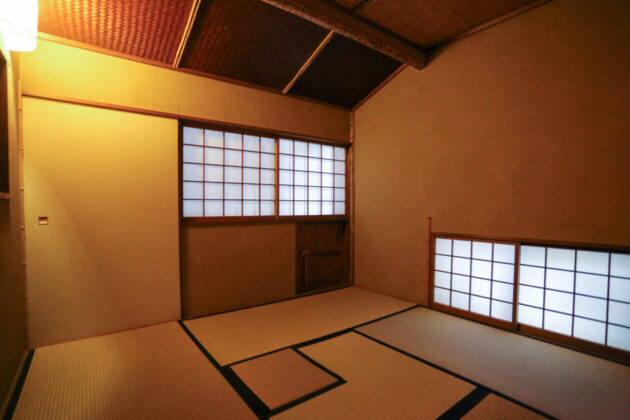 この一角に、一層しんと落ち着いた茶室があります。展示室から小さな中庭に出られるようになっていて、そこから再び躙口(にじりぐち)を通って茶室へ入ります。