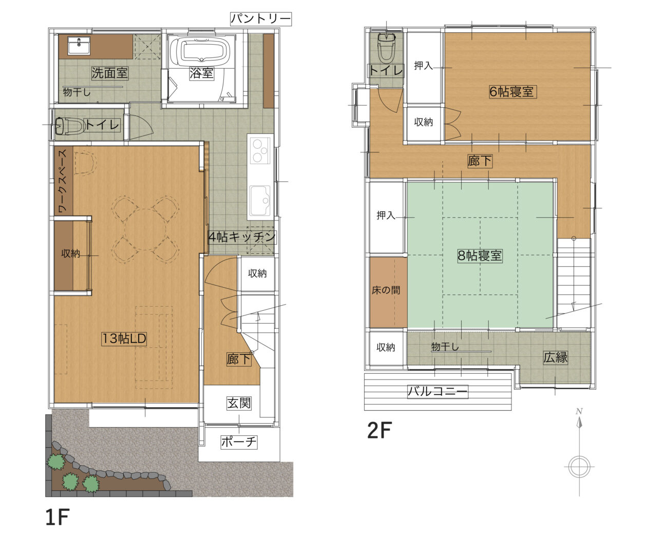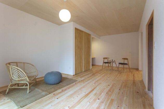 南北どちら側も開けていてとっても明るい2階!特に南側の和室は、広縁が室内干しも出来るサンルームになっていて陽当たりの良さを思いっきり活かしています。室内干しをしたり観葉植物を育てたりするのにぴったり。お子さんが小さいうちは、ゴロゴロできる畳もいいよねぇ…。