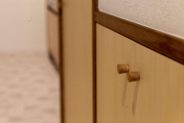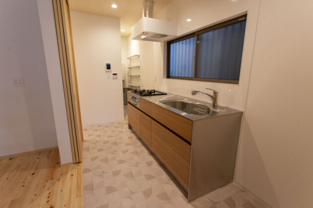 キッチンは、無印良品とミラタップコラボの製品。無印の家具と同じオーク材を使っています。奥の細いスペースは稼働棚のあるパントリー