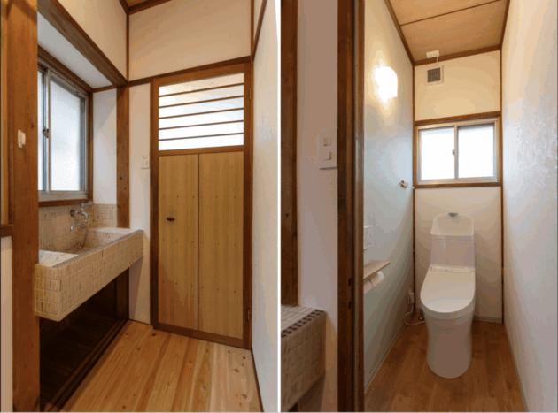 以前からのタイルの洗面台やトイレの戸を活かして、昭和のチャーミングさも感じられます