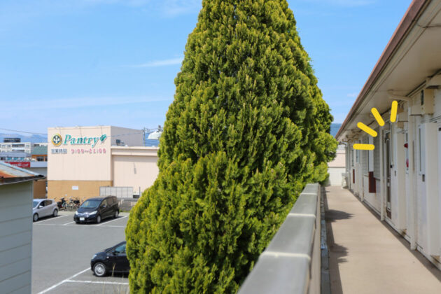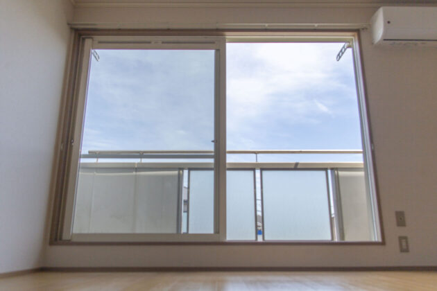 賃貸であまり見ないサイズ感だったので測ってみたら…なんと幅が約2.5mありました(1.8mくらいまでが一般的)。開け放つとやわらかい風がふわ〜っと入ってきて、LDKがなんとも心地よい空間でした。おまけに正面はこの物件の専用駐車場なので人通りが少なく、さえぎるものがなくて陽当たりが良いのです。