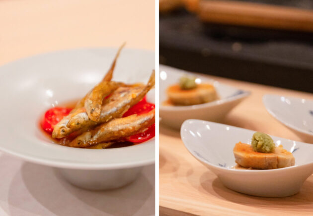 その日その瞬間にもっとも美味しいものを食べてほしいという想いから、メニューはおまかせコースのみ。この日はワカサギに始まり、鰆や筍、冬から仕込んでいたアン肝など、4月のはじめにぴったりの食材を使ったお料理が登場しました。どのお皿も美しく、ひとくち食べるごとにため息が出るほど美味しい…。(写真はコースの一部で提供順ではありません)