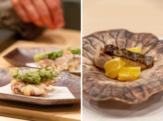 米粉の衣のサクサク感とホタルイカのとろっと感の塩梅が絶妙/小田原産湘南ゴールドの甘みが鰆をさわやかに彩ります