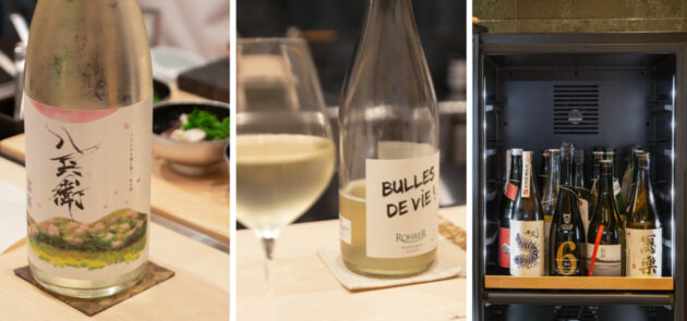 お酒はトレンド最先端のお酒からクラシカルな銘酒まで、様々な日本酒とワインが各30種類ほど用意されていて、まだ増えていく予定です。おちょこ一杯単位で頼めるので、お酒は好きだけどたくさんは飲めない…という方も気軽にあれこれ味わえます。どのお客さまにも最高の食体験をしてほしい、というおふたりの心遣いが嬉しいですね。