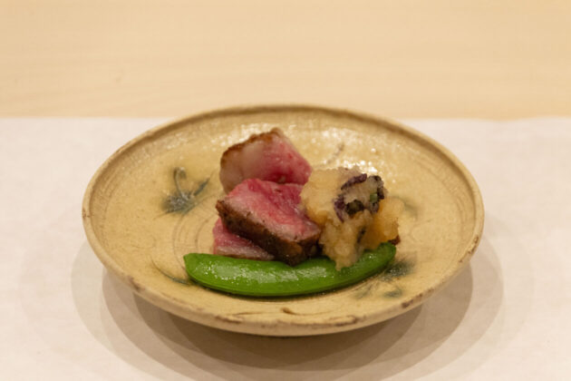 伊賀牛の炭火焼き。コースの後半でもおいしく食べられるよう脂が軽やかなお肉をセレクトされています