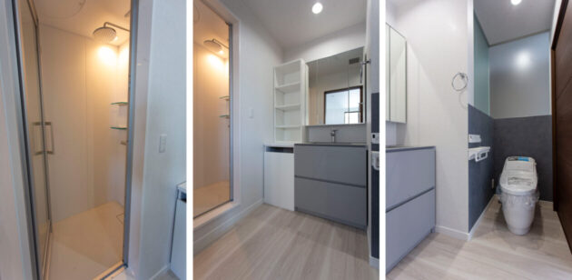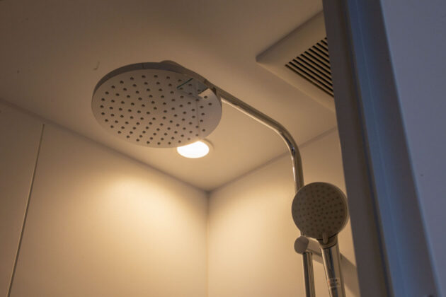 浴室の代わりにシャワールームがあって、海外のホテルのような「レインシャワー」で優しく垂直に水が落ちて全身を包み込んでくれます。ヘッドはドイツの「ハンスグローエ」というメーカーのもので、高級ホテルなどでも導入されているらしい…!シャワー派の方には充分な設備なのでは。