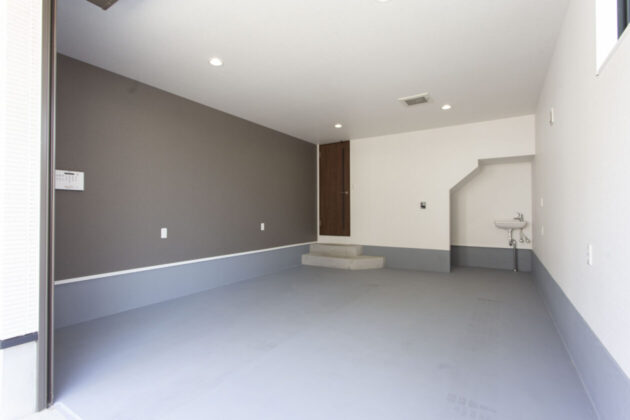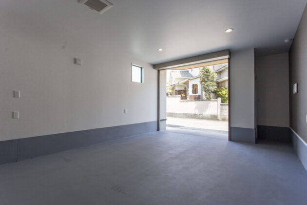 ガレージは幅3,640mm、奥行き6,370mm、間口は幅2,500mm、高さ2,400mmです。車を1台停めてもまだ少し余裕があるので、バイクや自転車、サーフボードやキャンプギアなど大きなものもいろいろ置けちゃいます。さらに棚を置いたり壁面に有孔ボードを設置すれば結構な容量になります。