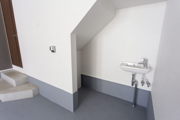手洗い場からはお湯が出ます。壁面に付いたグレーの箱はEV/PHV車用の電源です