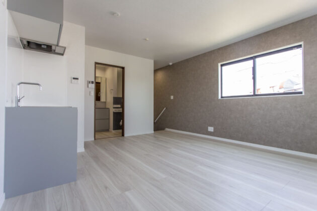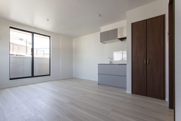 2階にあがった居室はシンプルなワンルームです。新築なので室内はピカピカ、設備はもちろんすべて新品です。