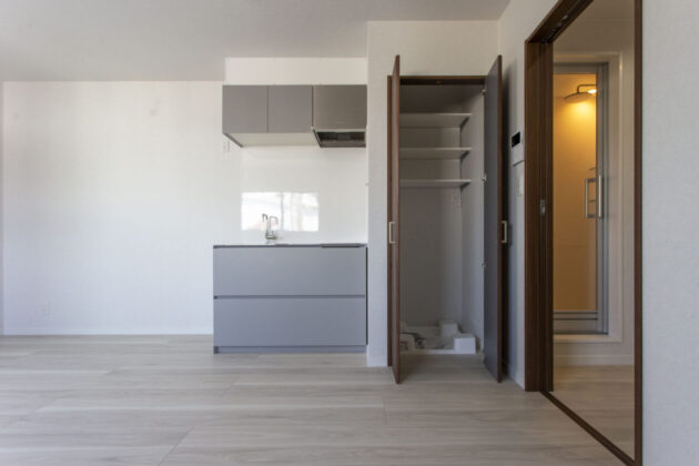 キッチンの隣のスペースは洗濯機置場。生活感を隠せます