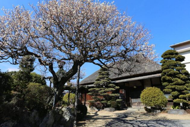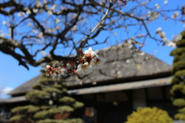 1月下旬にはお庭の梅が咲いていました!茅葺のおうちと雰囲気がとっても合っています。